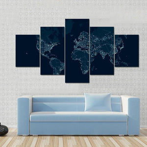 This canvas art features a centered world map highlighted by a constellation-like network overlay. With its modern palette of dark blue, white, and light blue, it brings an informative and global feel to any space.