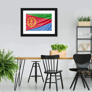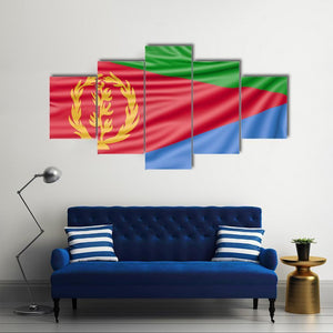 This canvas features the Flag of Eritrea with a bold, patriotic, formal presence. The symmetrical composition highlights a woven texture effect and wavy fabric folds in green, red, blue, and gold, giving the piece a modern look that suits contemporary home wall decor.