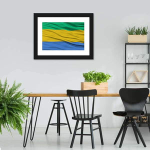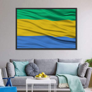 Featuring the waving flag of Gabon, this panoramic canvas captures a proud, nationalistic mood in bold green, yellow and blue. The modern, horizontally symmetric composition emphasizes motion and color and works well with contemporary room decor.