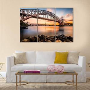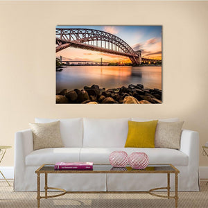 Hell Gate & Triboro Bridge Canvas Wall Art shows two bridges over water at sunset, with a rocky foreground and a cloud-streaked sky. The photographic, realistic image feels peaceful and warm, with orange, blue and grey tones. It works well in modern home decor as a calm, scenic focal piece.