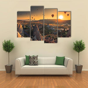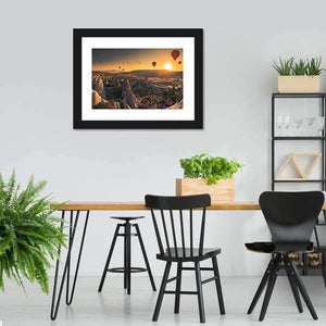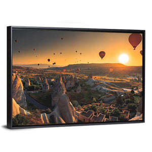This canvas features serene hot air balloons floating above Cappadocia's unique rock formations at sunset. The warm palette of orange, yellow, and brown brings a peaceful ambiance to any space.