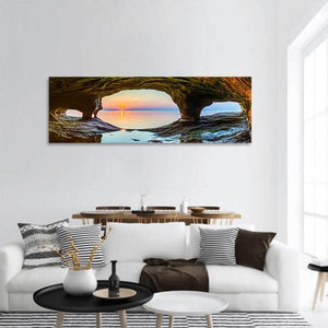 A panoramic view of Lake Superior seen from inside a sea cave at sunset, with the arched cave entrance framing calm water and rocky formations. The photorealistic scene blends cool blues and warm oranges for a serene, majestic mood. Works well in modern living rooms or offices seeking natural, calming wall art.
