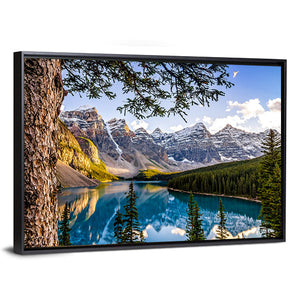 This stunning canvas art captures the serene beauty of Moraine Lake, surrounded by majestic snow-capped mountains and tranquil pine forests. The composition highlights the reflection of the towering peaks in the lake, evoking a sense of peace and connection to nature.