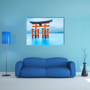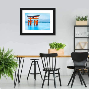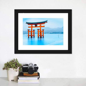 This canvas features a tranquil scene of a traditional Japanese torii gate standing gracefully in calm waters, framed by serene mountains. The artwork radiates a peaceful atmosphere, making it a beautiful addition to any living space.