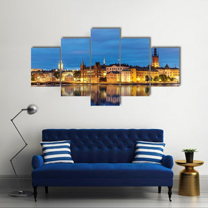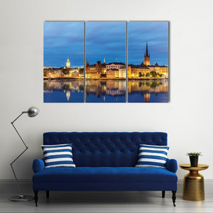 This canvas art captures the serene beauty of Stockholm's Old Town at dusk, showcasing its waterfront buildings and the tranquil reflections on the water. With a modern landscape style, it brings a calm atmosphere to any room.