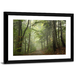 This canvas wall art features a serene forest path framed by lush trees, enveloped in gentle fog. The tranquil atmosphere and earthy palette of greens and browns invite a sense of calm, making it a harmonious addition to nature-inspired decor.