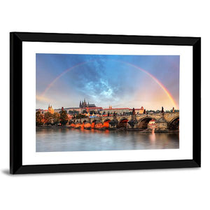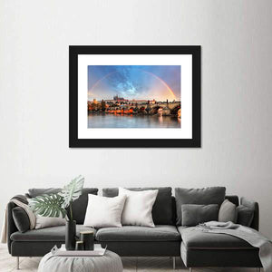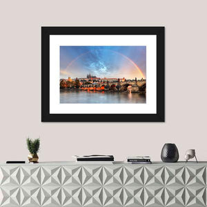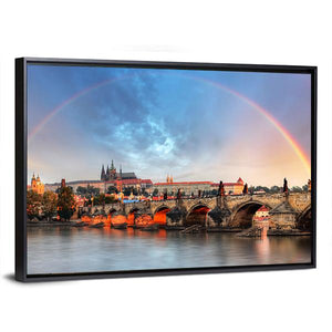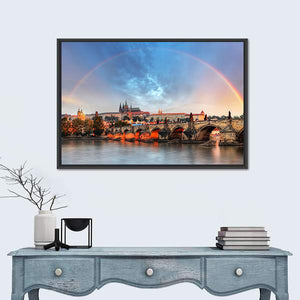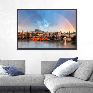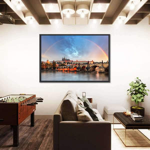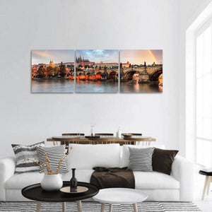 This panoramic canvas captures Charles Bridge, the Vltava River and Prague Castle beneath an evening sky touched by a rainbow. Rendered in a photorealistic, vibrant palette of orange, blue, brown, grey and yellow, the scene feels magical and serene and suits modern interiors as room decor.