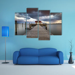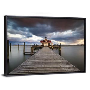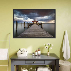 This canvas shows a wooden pier leading to the Roanoke Marshes lighthouse at dusk, with choppy ocean water and clear leading lines. Rendered realistically in blues, browns, white and grey, it carries a calm yet dramatic mood and suits modern or coastal room decor.