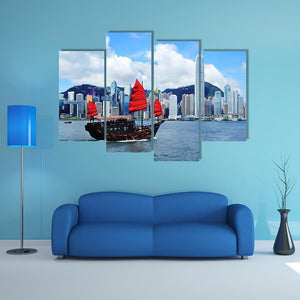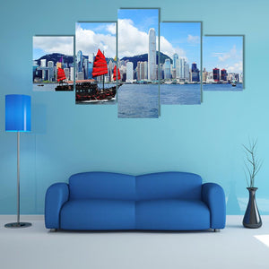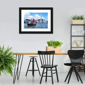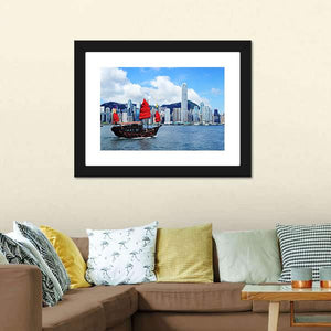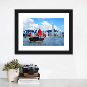 A realistic cityscape print showing a traditional junk boat with red sails crossing Hong Kong Harbour, with modern skyscrapers and a bright, busy harbor. Rule-of-thirds composition and pronounced depth give the scene a vibrant, adventurous mood that fits modern living rooms or home offices.