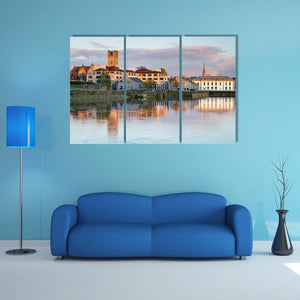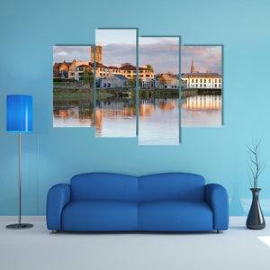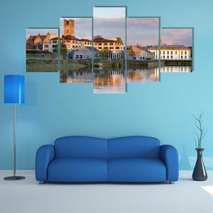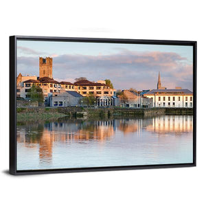 Shannon River Scenery in Ireland shows a quiet riverside town with a tall tower and spire reflected in calm water. The realistic landscape uses blues, browns, whites and soft pinks to create a calm, serene atmosphere. It suits modern or nature-inspired rooms as a peaceful, nature-focused wall accent.