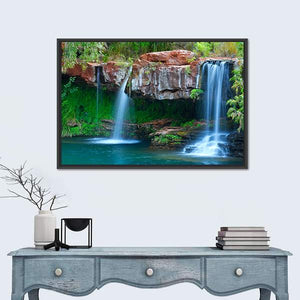 This canvas art beautifully captures a serene waterfall flowing into a lush fern pool in Australia. The natural palette of blue, green, and earthy tones creates a tranquil atmosphere, perfect for enhancing your room's décor.