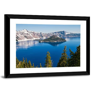 This canvas art beautifully captures the serene majesty of Crater Lake, showcasing a stunning reflection of the surrounding mountains, trees, and snow. With its realistic depiction in soothing blue and green tones, it adds a touch of nature to any room.