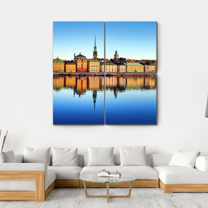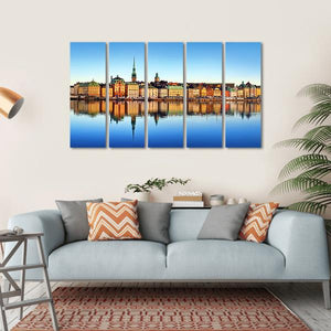 This canvas features a serene city skyline of Stockholm, beautifully reflecting on calm waters. The bright colors of blue, orange, and yellow create a tranquil atmosphere, making it an ideal piece for any modern décor.