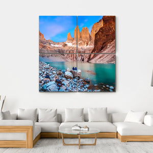 Capturing the serene beauty of Torres Del Paine National Park, this canvas features a tranquil mountain lake, rocky shore, and majestic peaks. The vibrant palette of blue, green, brown, and white invites a sense of awe, making it an ideal addition to any room in your home.