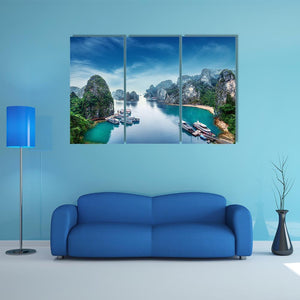 This serene landscape artwork captures the tranquil beauty of Ha Long Bay, showcasing lush green islands, boats, and clear turquoise waters. Its modern style makes it a perfect choice for enhancing living spaces.