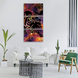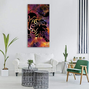 A stylized black lion silhouette stands central against a cosmic background of stars and nebulae, calling to the Leo zodiac and animal motifs. The black, orange, purple, and yellow palette with tribal-abstract, celestial details gives the piece a fierce, astrological energy that fits modern and astrology-themed rooms.