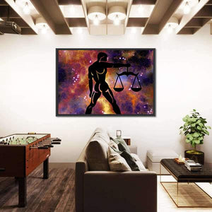 Embrace the celestial theme with this Libra canvas wall art, featuring a striking silhouette of a man holding scales set against a vibrant nebula background. Its bold colors and modern abstract design create a mystical atmosphere, perfect for adding intrigue to your space.