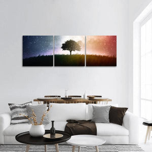 A lone tree silhouette rests on a quiet hill beneath a starry sky shifting from night toward dawn, painted in soft blues, purples and warm orange-pink hues. The abstract, minimalist scene feels dreamy and serene, a calm choice for modern living rooms, bedrooms, or a quiet office nook.
