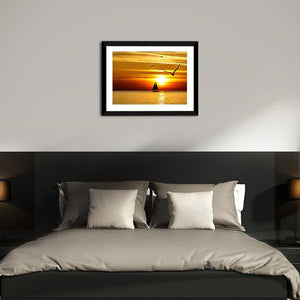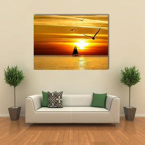 This canvas art features a silhouetted sailboat against a stunning sunset at sea. The warm hues of orange and yellow create a serene and tranquil atmosphere, perfect for enhancing any modern space.