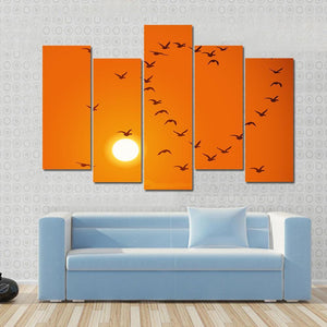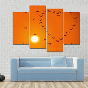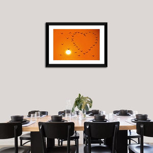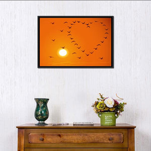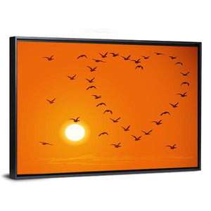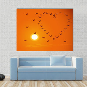 This canvas art features a beautiful flock of birds forming a heart shape against a stunning sunset backdrop. The warm orange and yellow hues create a romantic and peaceful atmosphere, making it a lovely addition to your wall decor.