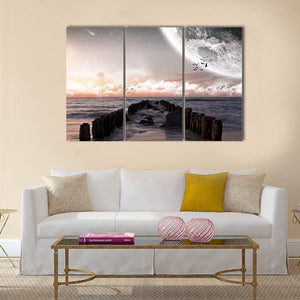 This canvas shows a wooden ocean pier reaching into calm water beneath a large moon and a starry twilight sky. The image blends dreamy, surreal tones of blue, gray and orange with a flock of birds and a shooting star for a quiet, contemplative mood. It works well in modern homes, especially living rooms or bedrooms seeking fantasy-style wall decor.