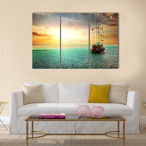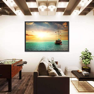 A sailboat crosses calm ocean waters as the sun sets, with birds and fluffy clouds and flags on the boat catching the light. This realistic seascape uses warm oranges and blues for a serene, majestic mood that suits coastal or modern rooms.