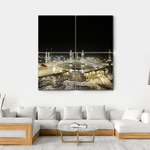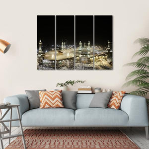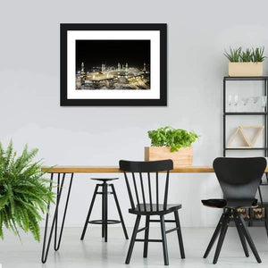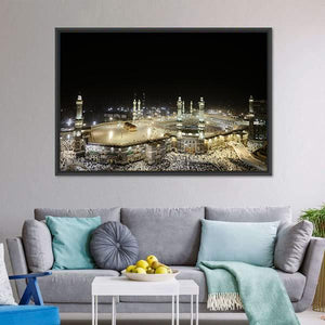 Capture the awe of Makkah at night with this stunning canvas featuring a beautifully illuminated mosque and minarets. The aerial view showcases a bustling crowd, evoking a deep spiritual atmosphere. This piece complements a variety of decorative styles, making it a warm addition to any space.