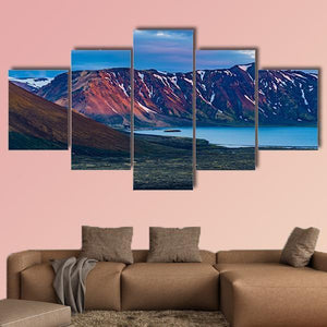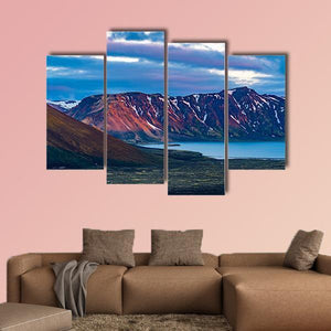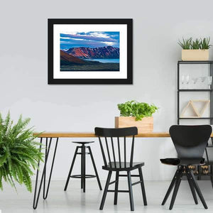 A realistic landscape of snow-capped mountains beside Lake Frostastadavatn under colorful clouds at sunrise or sunset. The wide, eye-level composition feels both serene and dramatic, and it fits modern rooms or nature-inspired decor.