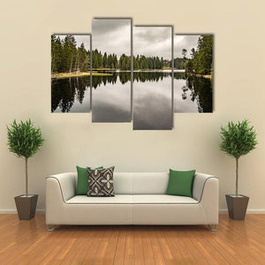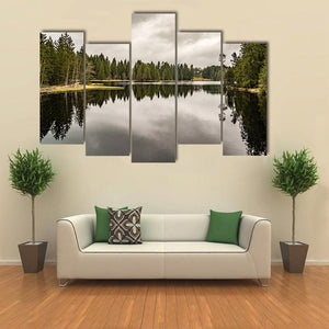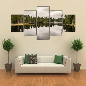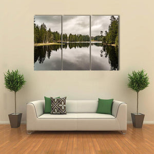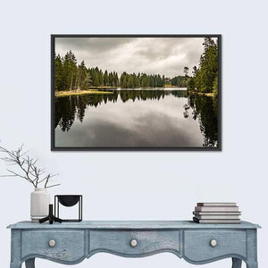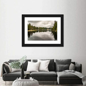 Mystery Lake With Forest depicts a quiet lake bordered by trees beneath an overcast sky, with the trees reflected in the water. The muted green, gray and brown palette creates a calm, somber mood that suits modern, nature-focused room decor like living rooms or bedrooms.