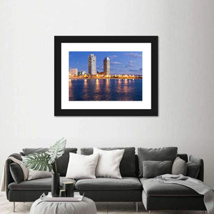 A calm, nighttime cityscape of Barcelona—skyscrapers meet the sea with city lights reflecting on the water. The cool blue, white and grey palette and modern style suit contemporary living rooms or offices looking for a serene focal piece.