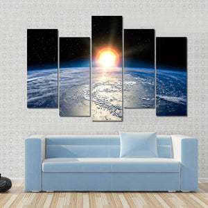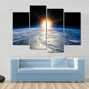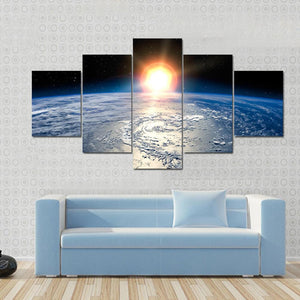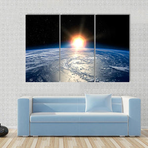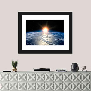 This canvas art captures a breathtaking view of Earth from space during a serene sunrise. The vibrant sunburst effect and detailed clouds lend an awe-inspiring quality, making it a striking piece for any space enthusiast.