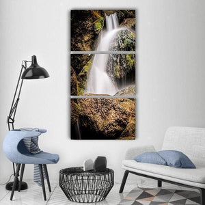This small canvas print shows a waterfall flowing over rocks and moss, captured with a long exposure that creates silky water and soft motion. Earthy browns, greens and greys plus a rule-of-thirds composition give a serene, natural feel that fits rustic and nature-inspired rooms.