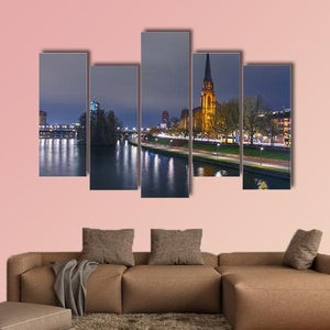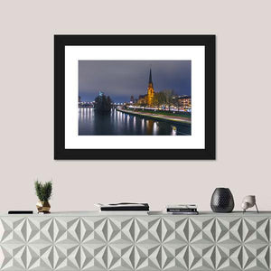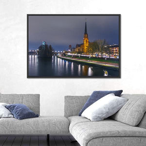 Three Wise Men Church Canvas presents a photographic cityscape of a riverside church and skyline at night. Illuminated buildings and their reflections in the water create a peaceful yet vibrant atmosphere with dark blue and warm yellow tones. Pairs nicely with modern or gray-toned living rooms and studies.