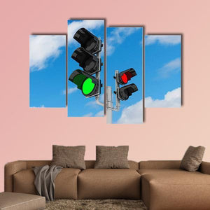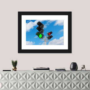 Traffic Light Signal Canvas Wall Art captures a clear, bright daytime view of traffic lights — one green and two red — set against cool blue and black tones. The rule-of-thirds composition gives it a modern, balanced feel that suits urban or contemporary home decor.
