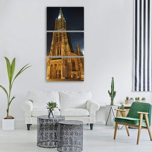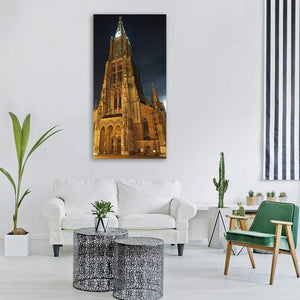 Ulmer Munster Cathedral at Christmas Lights presents a low-angle view of a Gothic cathedral, its detailed facade and pointed spire illuminated against a nighttime sky. The gold, brown, black and blue palette and dramatic, historic mood make it a strong choice for room decor that favors cityscapes or architectural pieces.