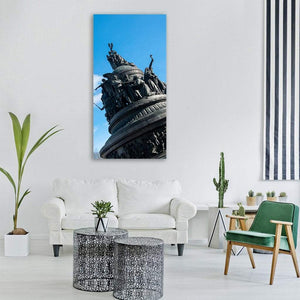 Veliky Novgorod's monumental architecture appears here as a realistic canvas print centered on a sculpted monument with detailed relief carvings. A low-angle viewpoint, cloudy blue sky and a blue-grey-and-bronze palette create a grand, historic mood that suits both modern and traditional room decor.