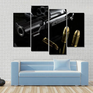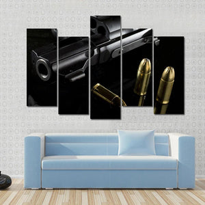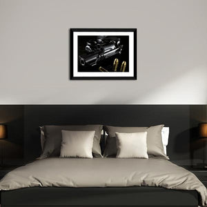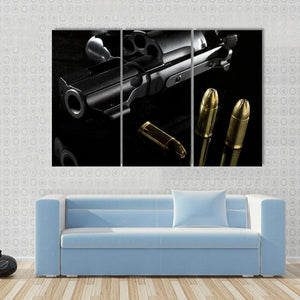 This canvas art features a dramatic close-up of a black revolver with open cylinder and three bullets in the foreground. With its intense and sophisticated vibe, it serves as a striking focal point for modern spaces.