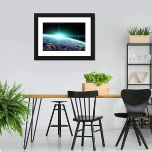 Experience the beauty of Earth from space with this stunning canvas print. It captures a serene sunrise over the planet, framed by a starry background and twinkling city lights that evoke a cosmic feeling. This art piece makes a perfect addition to any modern space.