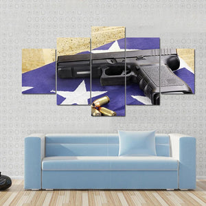 This powerful canvas art features a semi-automatic pistol resting on a folded flag, blending elements of history and patriotism. Its bold colors and vintage style evoke a strong sense of national pride, making it a striking decor piece.