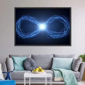 This abstract canvas features a swirling infinity symbol amidst glowing particles, capturing the essence of energy and motion. Its vibrant blue, black, and white palette creates an ethereal atmosphere, making it a striking addition to your space.