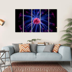 This abstract canvas features a captivating plasma globe surrounded by intense energy beams. The dynamic palette of blue, pink, red, and black creates an electric atmosphere, making it an eye-catching piece for any modern decor.