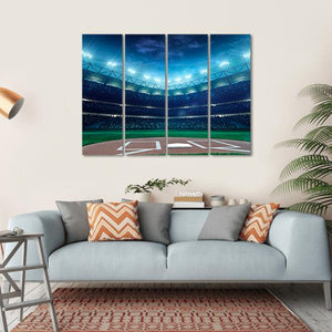 This canvas art captures the energetic spirit of a baseball stadium at night, with vibrant blue and green hues. The photorealistic wide view showcases lit stadium lights and a bustling crowd, perfect for sports enthusiasts or anyone wanting to bring excitement to their space.