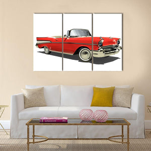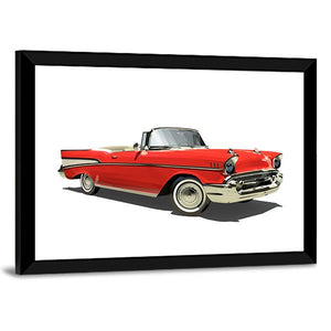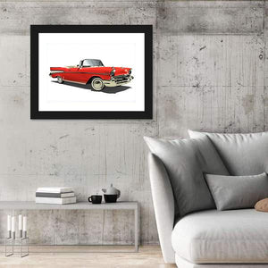 A red convertible car rendered in a vintage illustration style, shown in a diagonal, eye-level view. The piece feels classic, nostalgic, and vibrant, with red, white, chrome, and black tones and details like chrome accents, white wall tires, and a convertible top. It suits modern or retro-inspired rooms.