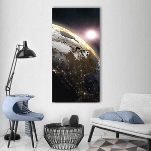 This photorealistic canvas depicts Earth from space, with a glowing sun cresting the horizon and city lights visible on the night side. Deep blues, warm yellows and blacks create a vast, awe-inspiring cosmic mood that suits modern or space-themed interiors.