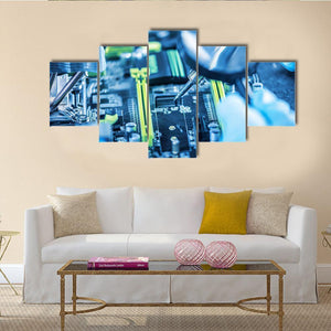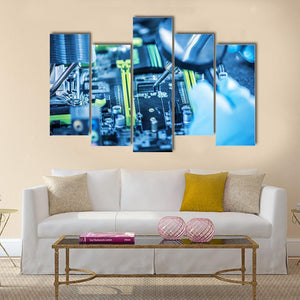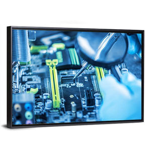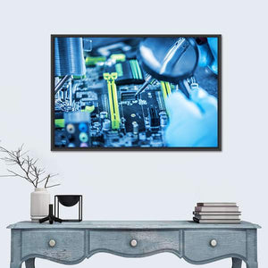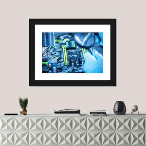 A close-up study of a gloved hand and magnifying glass inspecting a computer motherboard, with visible soldering iron tip and electronic components. Rendered in blue, green, black and silver, the image feels technical, intricate, and focused — suited to modern, technology-minded rooms like a home office or workspace.