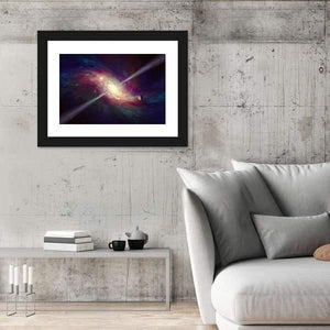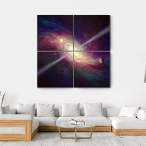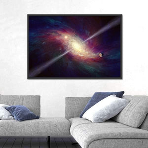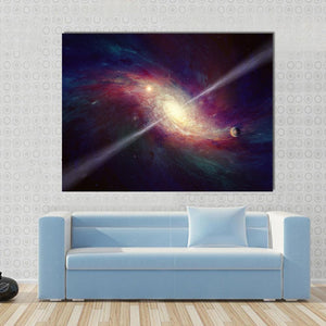 Experience the awe of the cosmos with this canvas wall art featuring a vibrant galaxy. Stunning details like glowing jets and a barren planet evoke a sense of mystery and power that complements modern decor beautifully.