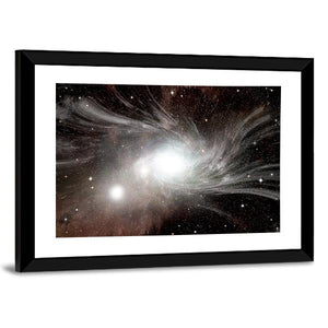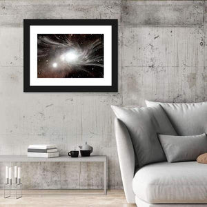 This canvas wall art captures a breathtaking young spiral galaxy entwined with a small dwarf galaxy. Its swirling cosmic dust and bright central core create an awe-inspiring sense of depth and vastness, making it a striking addition to your wall decor.