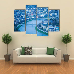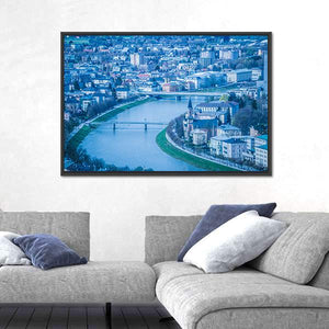 Aerial view of Salzburg showing the city, curving river, and arch bridge. The modern cityscape in blue, white, grey, and green creates a calm, urban, and expansive atmosphere. Works well in modern living spaces and contemporary room decor.