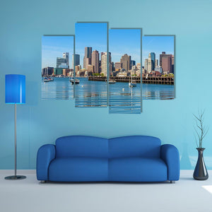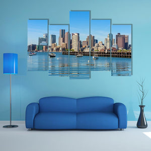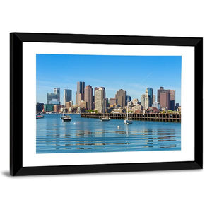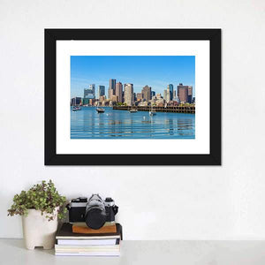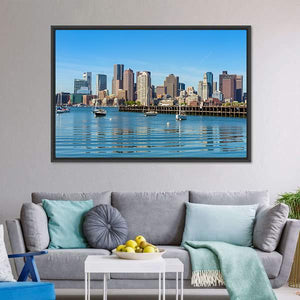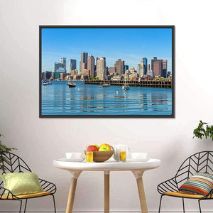 This beautiful canvas showcases the iconic Boston skyline, featuring tall buildings and boats on a calm harbor. The bright colors and photorealistic style create a serene urban atmosphere, perfect for any modern living space.