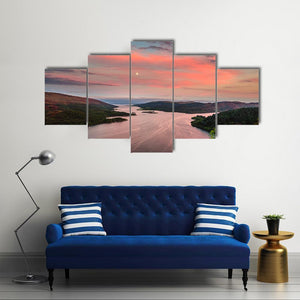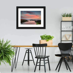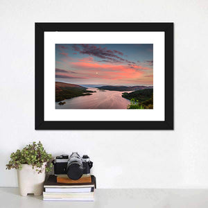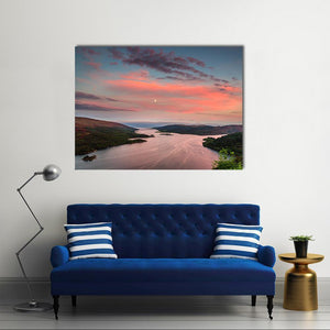 This serene landscape features a winding river, majestic mountains, and a full moon surrounded by soft pink and blue clouds. Its peaceful vibe makes it a beautiful addition to any space, offering a touch of nature's tranquility.